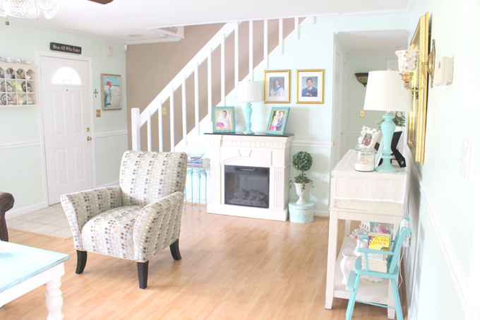 You've created a very pretty space! It's all lovely! I love the wall color, the coffee table is adorable and the chair rails are a nice touch!